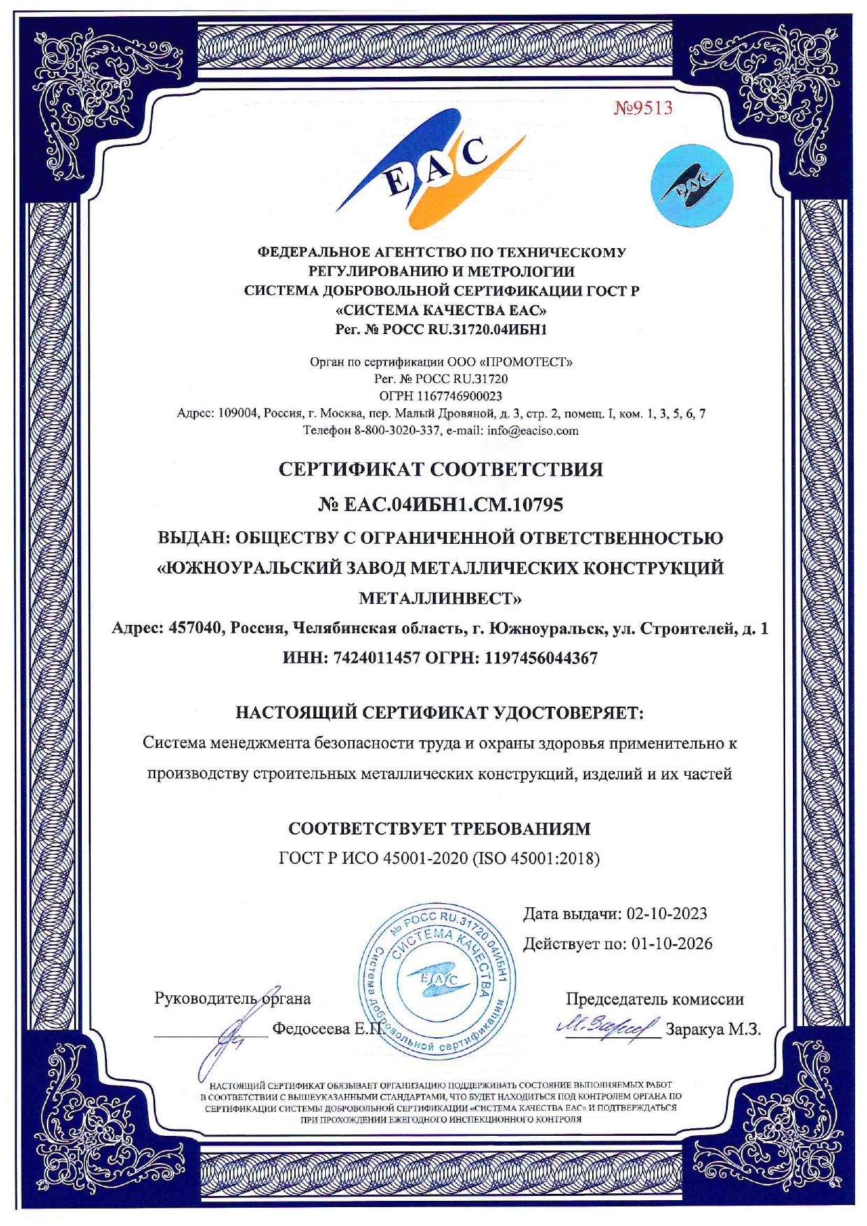 Сертификат соответствия ГОСТ Р ИСО 45001-2020